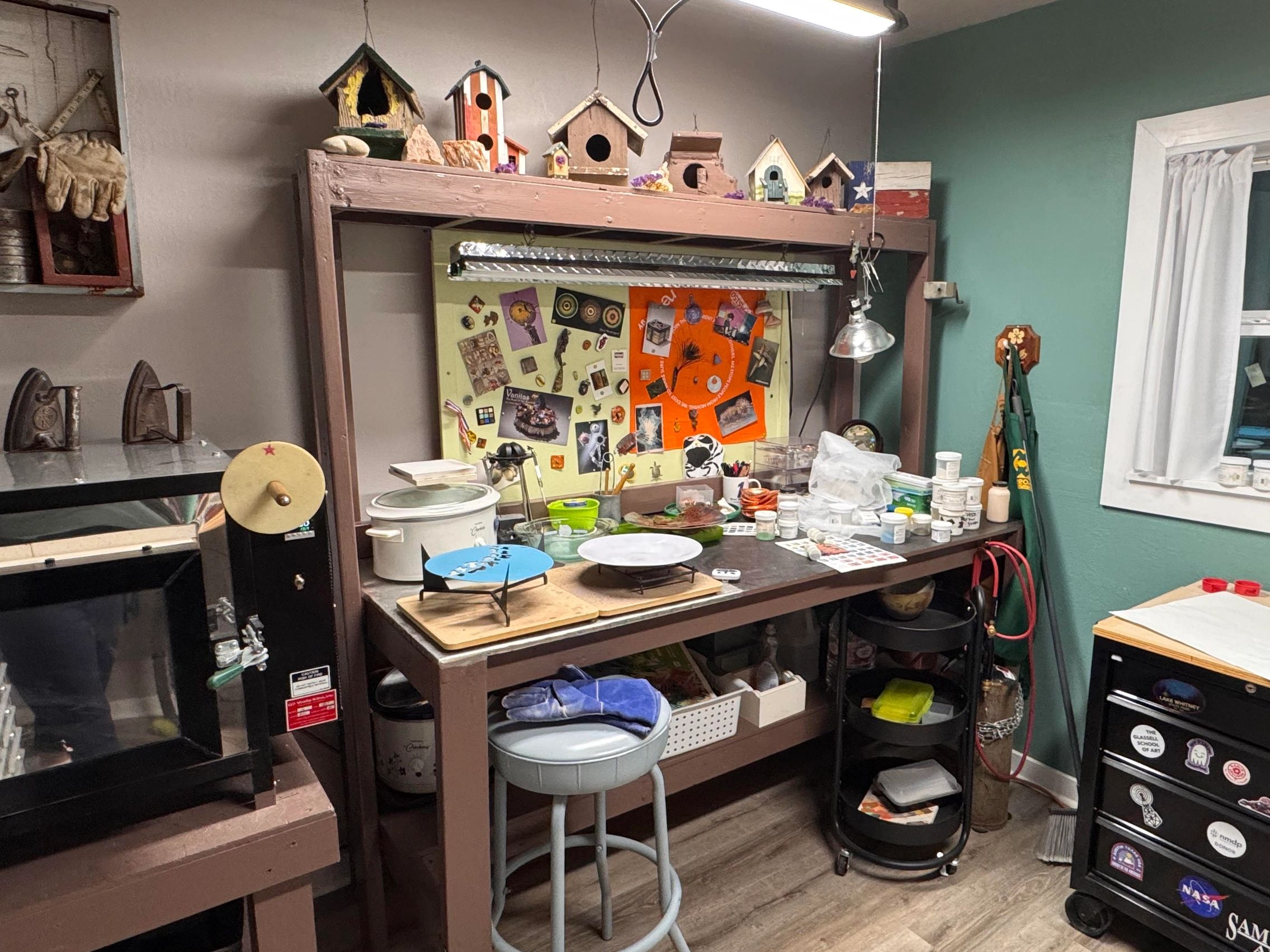 I started in a grungy garage. Just a solder bench, an old kiln, mosquitoes and the Texas heat. Fast forward to now. I’ve worked hard to turn a corner of my garage into my perfect studio heaven. I had my contractor build out a 10’x10’ room with insulated walls and ceiling, nice floors and even a window.